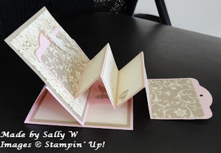 In class last night my ladies made a Mothers day gift set, I saw a fabulous card on Catherine Poolers blog last week using the Two Tags Die and decided I wanted to case it, but I changed it up by making an Easel card to add the tag to, we also made a small gift with the Two Tags Die to hold two yummy chocolates which I had to stop myself from sampling. If you would like to learn how to make one of these sets as a birthday gift or other just send email me.
