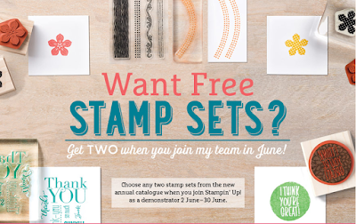 Have you thought about Joining Stampin' Up! well now is the perfect time, until June 30th if you join you will get to choose an extra 2 stamps sets of your choice for FREE in your starter Kit.Join for only $189 and you get a kit to the value of $285 plus the two free stamps sets of your choice what an awesome deal. Don't miss out. Email me for more information